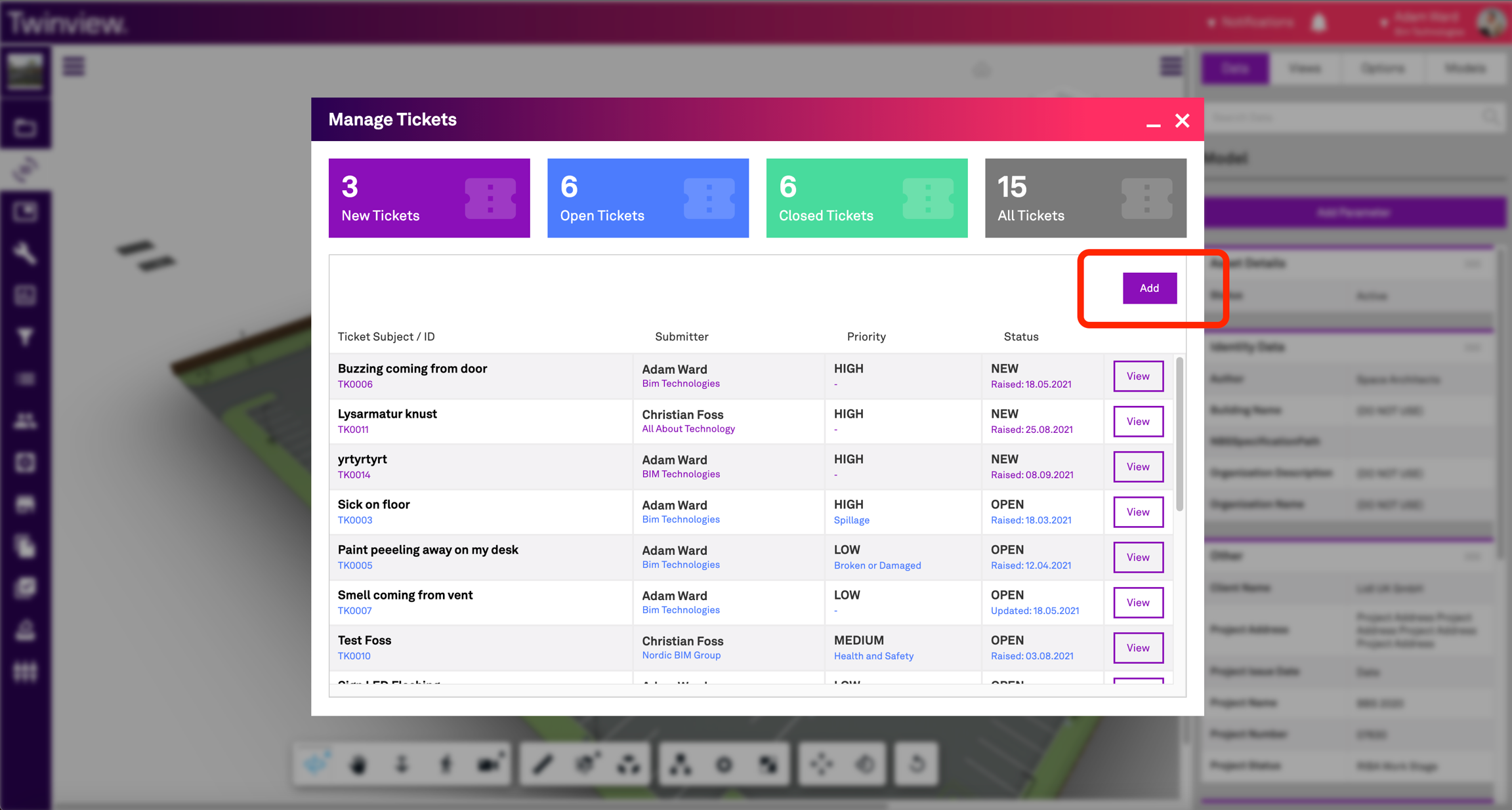 Step 2 - When the ticket manager modal appears, you can raise a new ticket by clicking 'Add' in the top right, as shown below.